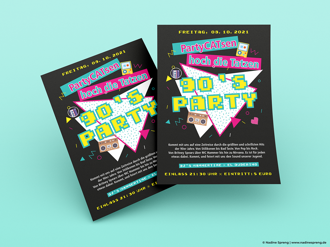 Die Idee war viele visuelle Elemente aus den 90ern sowie der Popkultur auf den Flyer zu bringen, damit das Thema gleich erkennbar ist.