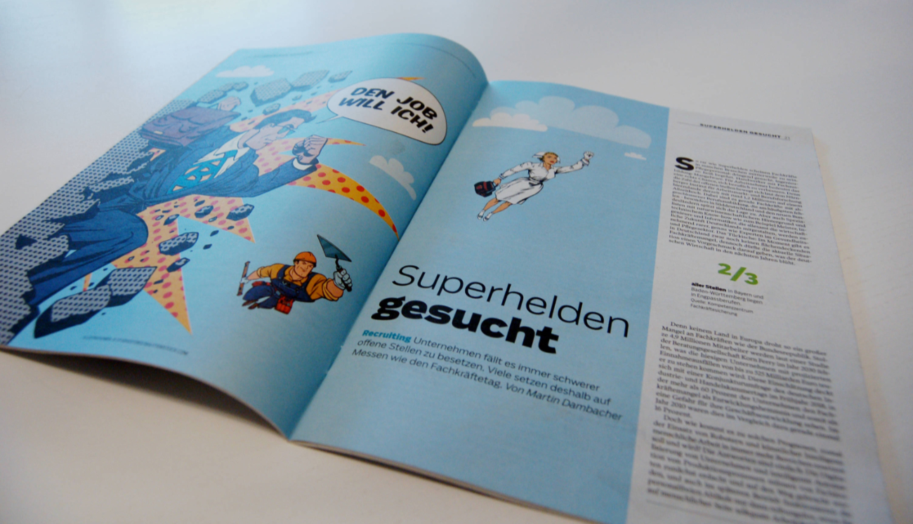 Die konzeptuelle Idee lag hier bei der Darstellung, die Fachkräfte als Superhelden im Comicstil zu zeigen. Wir wollten damit einen frischen und positiv behafteten Style in das doch etwas tröge Thema bringen.